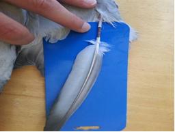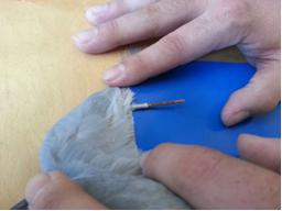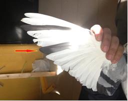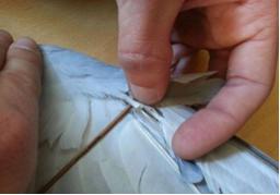 2º.- La pluma que se va a injertar se debe cortar con el cortaúñas de guillotina a unos 15-25mm desde la piel, si la fractura la tenemos en la base, limpiaremos los bordes con las tijeras de punta fina,, y pondremos una cartulina por debajo para evitar ensuciar el resto. |