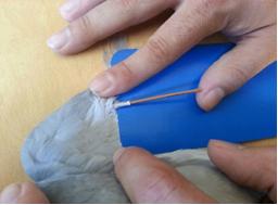 7º.- Introduciremos la varilla en el cañón y colocaremos la pluma en su posición natural. Marcaremos ambos extremos de las secciones con un rotulador para evitar posibles errores en su posterior colocación. Extraeremos el injerto, echaremos pegamento en la varilla y lo volveremos a introducir rápidamente haciendo coincidir las marcas anteriormente realizadas. |